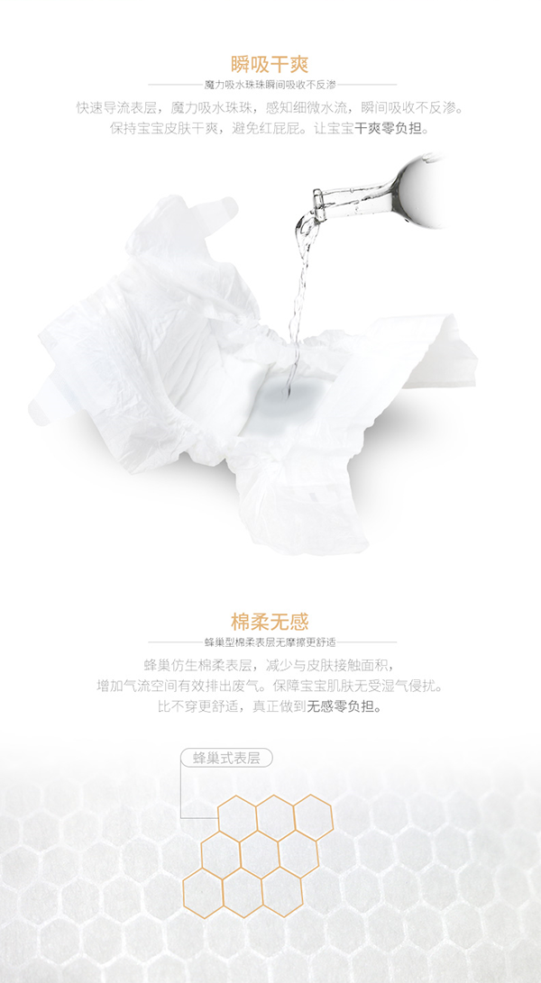 自主專(zhuān)利,懸浮芯體,自動(dòng)翻邊防側(cè)漏,我們只做高品質(zhì)的紙尿褲。