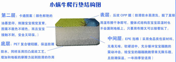 小蝸牛爬行墊無毒無味,防潮隔濕,超大無縫,表面附帶精美的童話圖案,從寶寶學(xué)爬到練習(xí)走路,再到大點在地上玩耍蹦跳,都是不錯的選擇,是寶寶健康快樂成長的好伴侶。