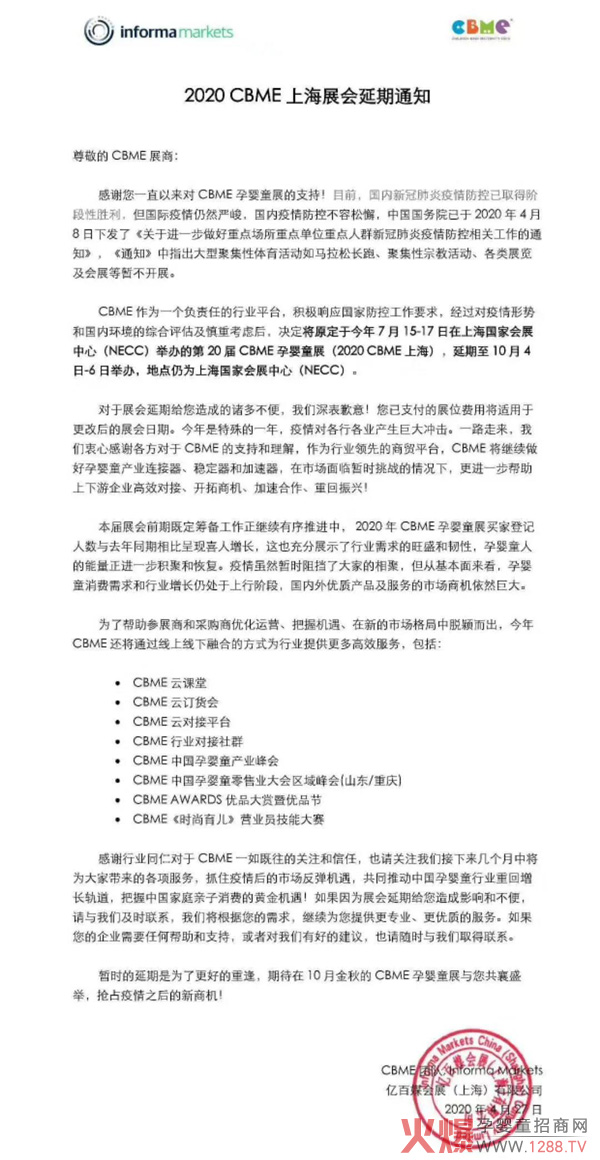 受疫情影響,今日CBME官方發(fā)聲明確定2020孕嬰童會展延期,決定將原定于今年7月15-17日在上海國家會展中心(NECC)舉辦的第20屆CBME孕嬰童展(2020CBME上海),延期至10月4日-6日舉辦,地點(diǎn)仍為上海國家會展中心(NECC)。